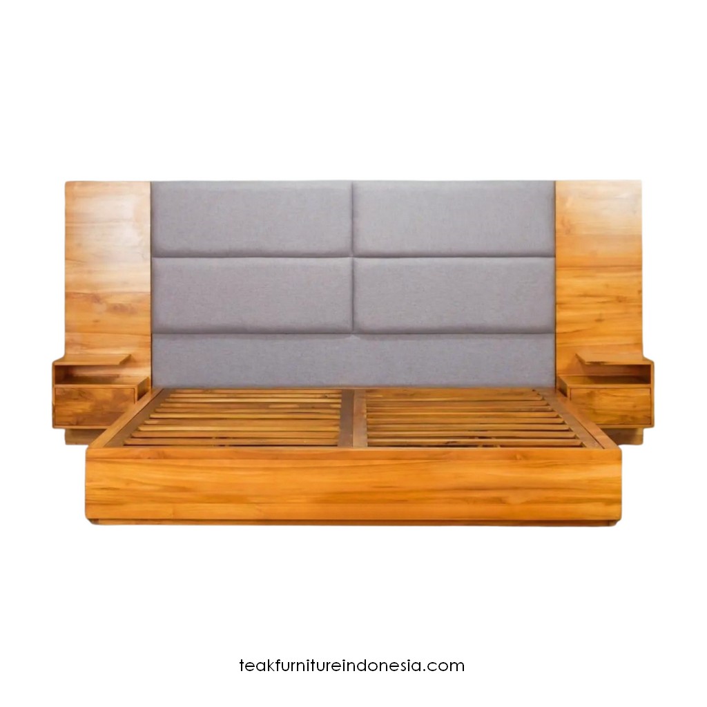 Minimalist Teak Wood Platform Upholstered Bed Frame with Natural Grain, Built-In Ledges, and Muted Taupe Upholstery